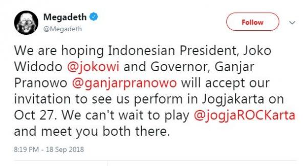 “Kami berharap Presiden Indonesia, Joko Widodo @jokowi dan Gubernur, Ganjar Pranowo @ganjarpranowo akan menerima undangan kami untuk melihat kami tampil di Jogjakarta pada tanggal 27 Oktober," tulis mereka, seperti iNews.id kutip dari akun Twitter @Megadeth, Selasa 18 September 2018.