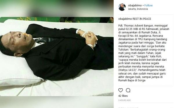 Hal tersebut diungkapkan oleh salah satu sahabatnya Obaja Kusumonegoro melalui akun Instagram pribadinya. "Pdt Thomas Alven Bangun meninggal pukul 02.35 wib di RS Fatmawati, jenazah disemayamkan di rumah duka Jl. Kecapi II no 64 Jagakarsa, Jakarta Selatan dan akan dimakamkan di TPU Kampung Kandang hari Minggu besok," tulis akun instagram @obajabimo.
