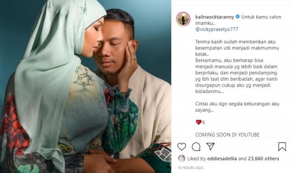 “Untuk kamu calon imamku..@vickyprasetyo777, terima kasih sudah memberikan aku kesempatan untuk menjadi makmummu kelak,” tulis Kalina, seperti dikutip dari Instagramnya, Minggu (13/12/2020).