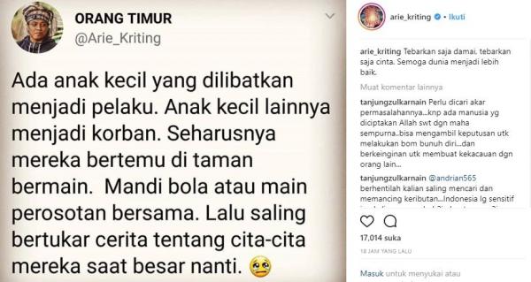 “Ada anak kecil yang dilibatkan menjadi pelaku. Anak kecil lainnya menjadi korban. Seharusnya mereka bertemu di taman bermain. Mandi bola atau perosotan bersama. Lalu saling bertukar cerita tentang cita-cita mereka saat besar nanti,” katanya dalam keterangan gambar yang diunggah di akun Instagram @arie_kriting, Senin (14/5/2018).