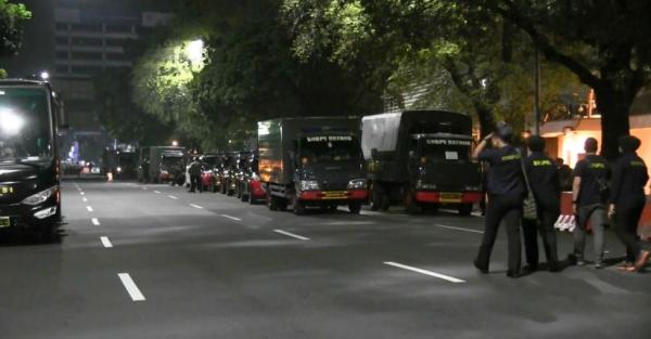Sejumlah kendaraan taktis Polri bersiaga di depan Kedubes AS di Jalan Medan Merdeka Selatan, Jakarta Pusat, Jumat (11/5/2018) dini hari WIB. Keberadaan kendaraan tersebut dalam rangka mengamankan Aksi Bela Palestina (Aksi 115) di sekitar kawasan Ring 1 Jakarta. (Foto: iNews/Rio Manik)