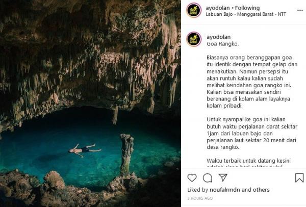 "Untuk sampai ke gua ini kalian butuh waktu perjalanan darat sekitar 1jam dari Labuan Bajo dan perjalanan laut sekitar 20 menit dari Desa Rangko. Waktu terbaik untuk datang ke sini adalah siang hari sekitar pukul 12.00-14.00 karena sinar matahari pas sekali menyinari dalam gua. Pokoknya ga puas rasanya ke Labuan Bajo tapi gak main ke Gua Rangko. Foto dolan dari @marnalamarbun," tulis Instagram @ayodolan, dikutip Selasa (18/2/2020).