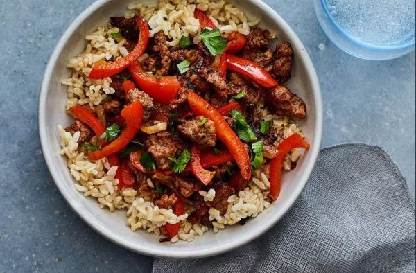 Semangkuk daging sapi dan nasi akan mengenyangkan perut. Menu ini menjadi kombinasi lezat dan besar. Ada bawang bombay dan lada, ditambah bubuk cabai dan paprika untuk bumbu. Bahan yang dibutuhkan adalah minyak zaitun, bawang bombai, paprika, cuka beras, bawang putih, daging sapi, garam, lada, serbuk cabai, nasi merah dan peterseli segar.